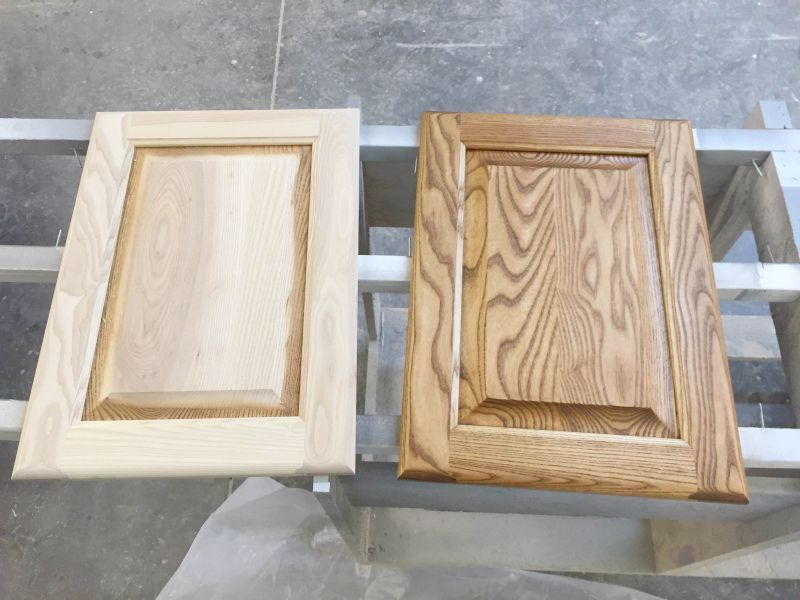 This morning the wife and I got the doors and drawer fronts stained with the Old Masters Provincial penetrating stain.