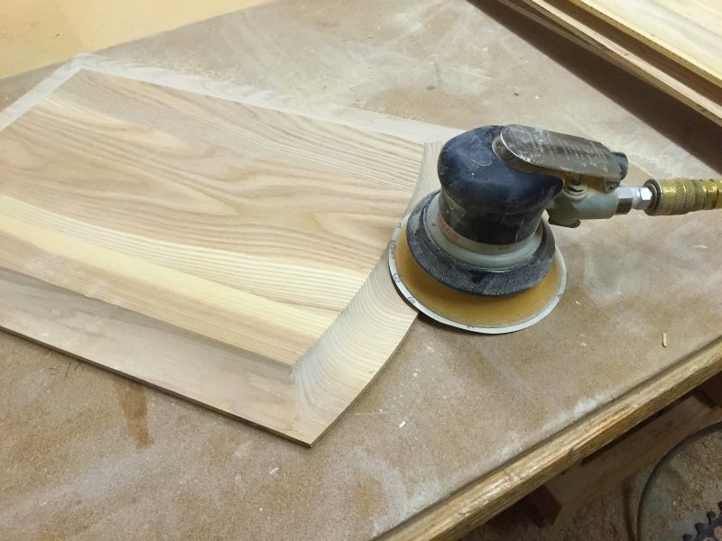 I use a pneumatic Dynabrade random orbital sander for this job. The pad is flexible enough to mold to the convexed shape. #180 paper makes quick work of this job. I sand both the shaped portion and the back of the panel. The front will get smoothed up when I run the doors through the Wide Belt sander later.